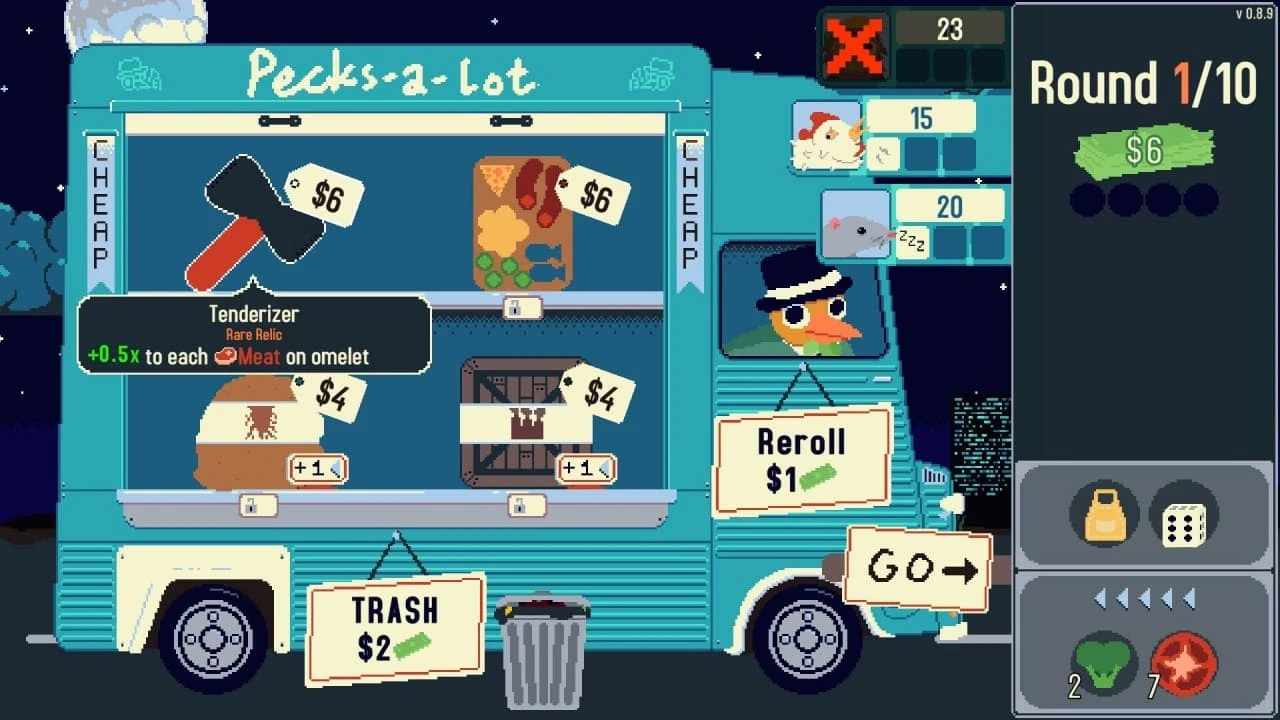 Геймплей развивается по принципу нарастающей сложности. Каждый раунд добавляет новые ограничения, производственные риски и повышенные требования к очкам. Механика приготовления построена на управлении потоком ингредиентов и стратегическом использовании инвентаря. Игроку доступна коллекция из 45 различных составляющих, включая как традиционные продукты, так и неожиданные комбинации вроде пончиков или ананаса. Система прогресса включает 30 реликвий, создающих синергию между выбранными предметами и усиливающих эффективность комбинаций.
